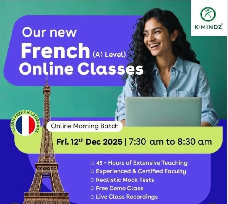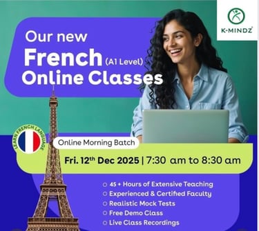 At KMINDZ EDUCATION JAIPUR, our French language classes are designed for learners of all levels—from beginners to advanced speakers—who wish to master one of the most beautiful and widely spoken languages in the world. Whether you're learning French for academics, travel, immigration, job opportunities, or personal growth, we offer a structured curriculum that builds your listening, speaking, reading, and writing skills with cultural immersion and confidence-building activities.